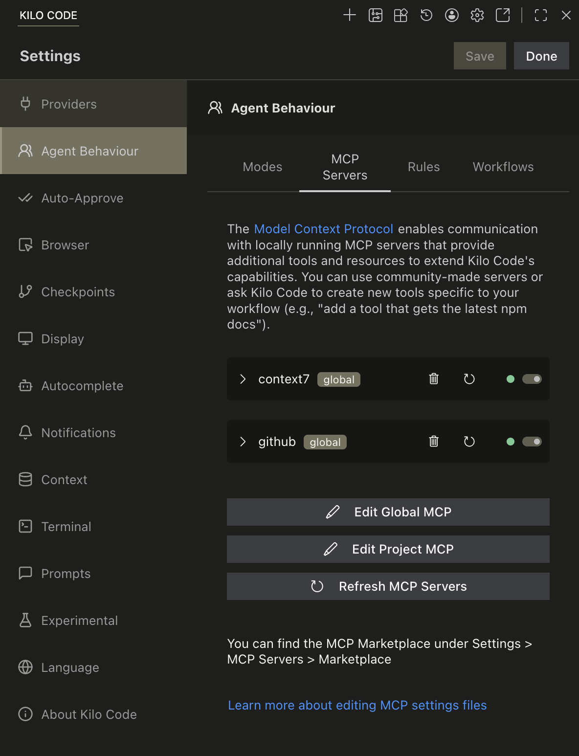 You can edit both global and project-level MCP configuration files directly from the Kilo Code settings.